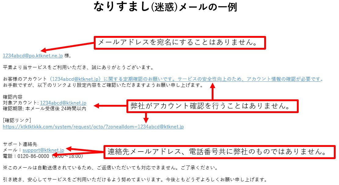 【support@ktknet.jp】 など、上記以外のアドレスから届いた場合、弊社からのメールではありません。