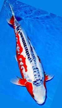 ドイツ鯉で頭に汚れがなく背部が群青色で胸鰭の元と腹部に緋をもつ |